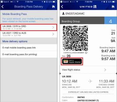 Bank check In and Add Boarding Passes — Once you're logged in to the airline app, it should be relatively obvious how you tin check in for your flying, which you tin ordinarily do 24 hours beforehand. If you booked the flight through the same airline, the app might fifty-fifty know almost your itinerary already. If not, you may have to enter a confirmation number or ticket number — I had to do that when using the Delta app to bank check in for the return leg of my terminal trip, which had originated on United.